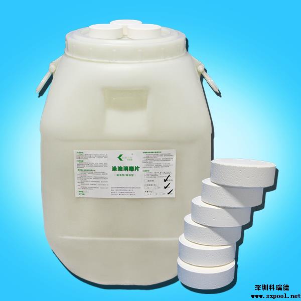 游泳池消毒片有速溶及緩溶兩種,也是以氯為主要成分,速溶的游泳池消毒片(2克/片)速溶含氯量消毒劑,氯味很重,可以直接撒入水中,包裝分為4.5kg/桶、12kg/箱和50kg/桶;緩溶的游泳池消毒片(200克/片)含氯量較高,但是需要專門投藥器才能使用,包裝有4.5kg/桶、20kg/桶和50kg/桶。