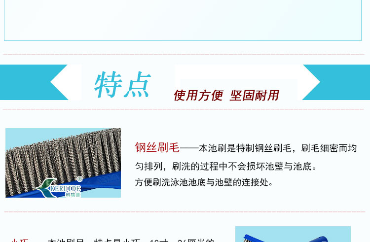 本池刷是特制鋼絲刷毛,刷毛細密而均勻排列,能有效刷洗池底及池壁頑固的青苔,使用過程中不會傷害池壁與池底。