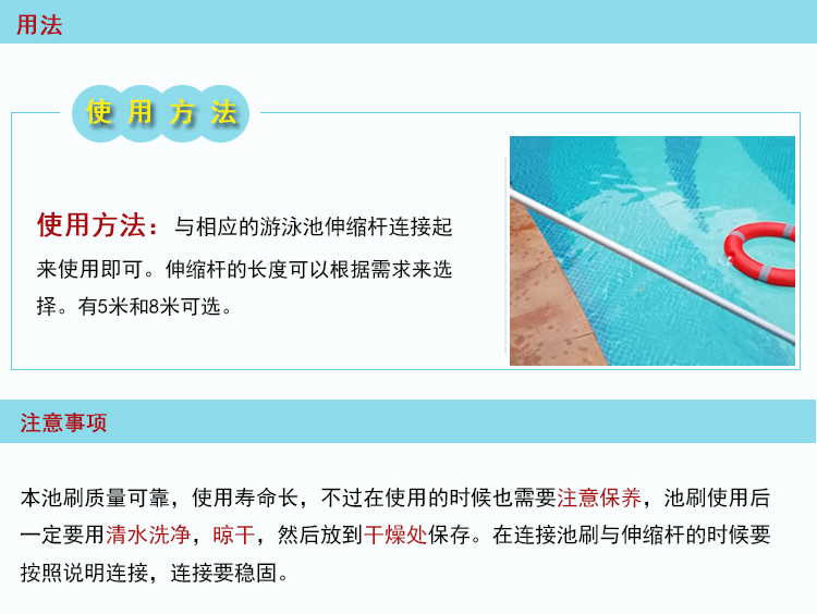 提示:在連接池刷與伸縮桿的時候要按照說明連接,連接要穩固,池刷使用完后要清洗干凈,晾干后再保存。