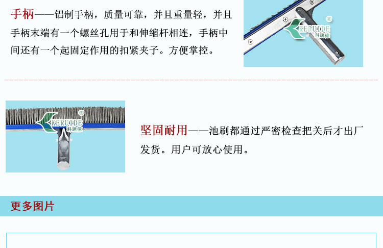 【手柄】:鋁制手柄,質量可靠,并且重量輕,并且手柄末端有一個螺絲孔用于和伸縮桿相連,手柄中間還有一個起固定作用的扣緊夾子。方便掌控。