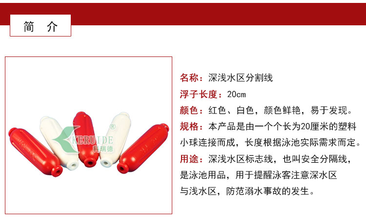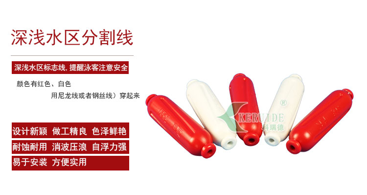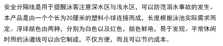 本產品是由一個個長為20厘米的塑料小球連接而成,長度根據泳池實際需求而定。浮球顏色由兩種,分別為白色以及紅色,顏色鮮艷,易于發現。
