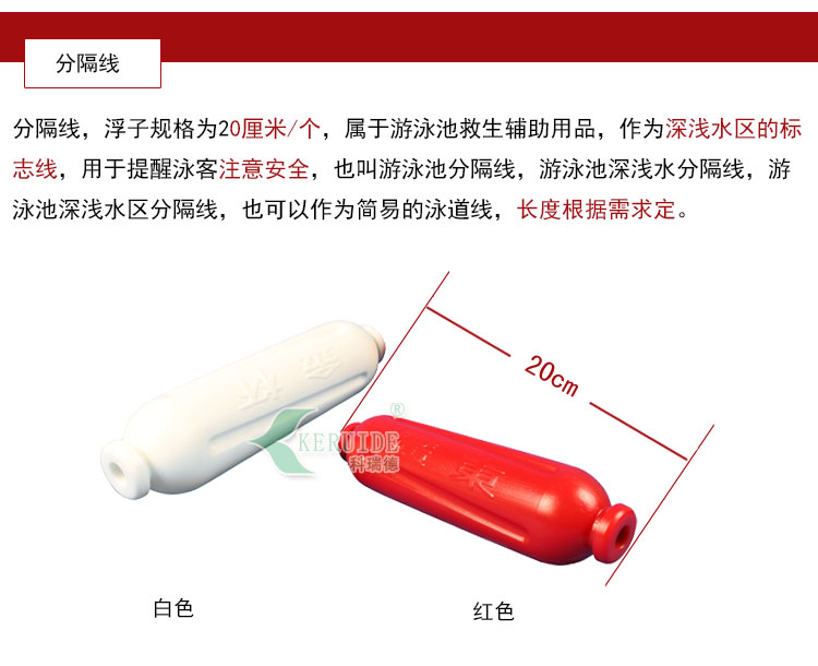 分隔線,規格為20厘米/個,屬于游泳池救生輔助用品,作為深淺水區的分道標志線,用于提醒泳客注意安全,也叫游泳池分隔線,游泳池深淺水分隔線,游泳池深淺水區分隔線,也可以作為簡易的泳道線,長度根據需求定。