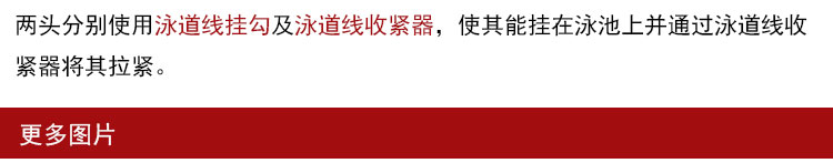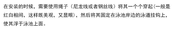 在安裝的時候,需要使用繩子(尼龍線或者鋼絲線)將其一個個穿起(一般是紅白相間,這樣既美觀,又顯眼),然后將其固定在泳池岸邊的泳道掛鉤上,使其浮于泳池上面。