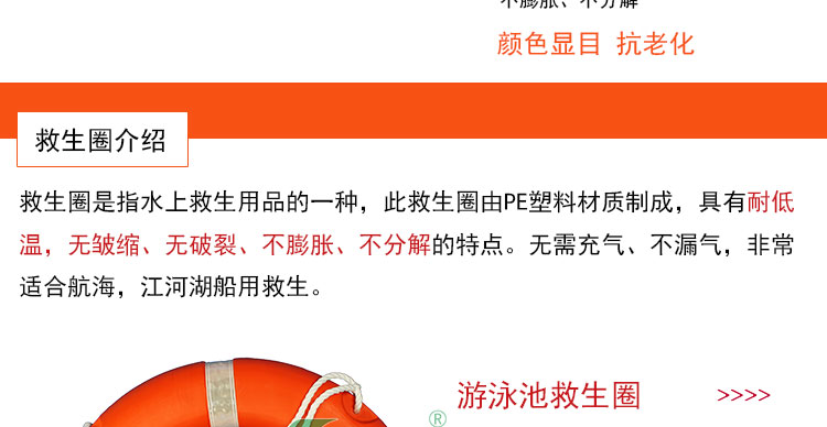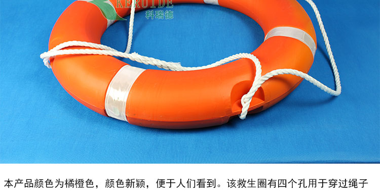 本品顏色為橘黃色,顏色非常鮮明,質(zhì)量可靠、無需充氣、不變形等特點(diǎn)。該救生圈有四個孔用于穿過繩子,便于岸上救生。