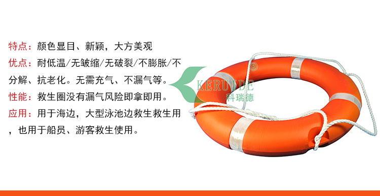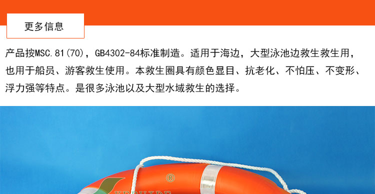 產(chǎn)品按MSC.81(70),GB4302-84標(biāo)準(zhǔn)制造。適用于海邊,大型泳池邊救生救生用,也用于船員、游客救生使用。本救生圈具有顏色穩(wěn)定、抗老化等特點(diǎn)。是很多泳池以及大型水域的選擇。