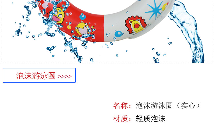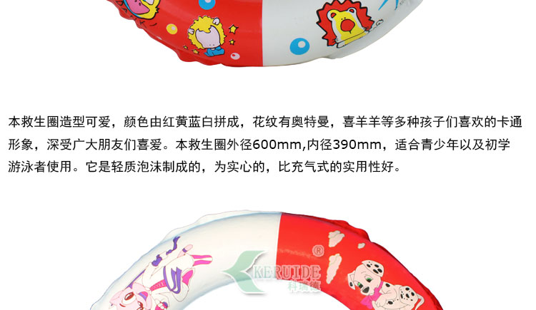 救生圈造型可愛:顏色由紅黃藍白拼成,花紋有奧特曼,喜羊羊等孩子們喜歡的形象,深受廣大朋友們的喜愛。適合青少年以及初學游泳者使用。它由輕質泡沫制成的,實用性比充氣的救生圈好。