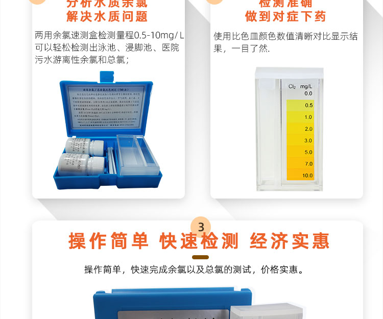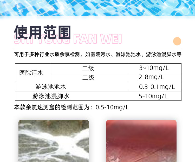 兩用余氯速測盒能用于游泳池浸腳池及醫院污水的余氯檢測,一般這些場所要求的余氯是比較高的,為5-10mg/L,而我們的兩用余氯速測盒的檢測范圍是:0.5-10mg/L,其操作簡單、快速,適合游泳、泡腳池、醫院污水等場所日常檢測。