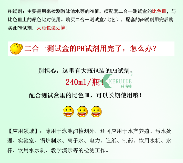 PH試劑,是二合一比色計的配套試劑,用來檢測游泳池水或是景觀水及各種循環水的PH值,其顯示的顏色與二合一比色計所配套的比色皿上色卡相對應。