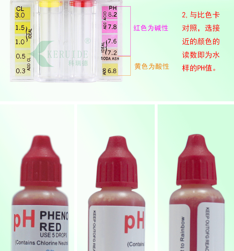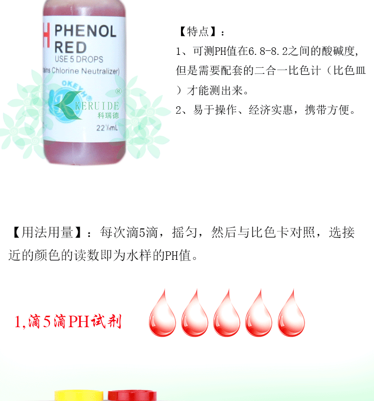 每次滴5滴PH試劑,搖勻,即可與色卡對照,選接近的顏色的讀數即為水樣的PH值。