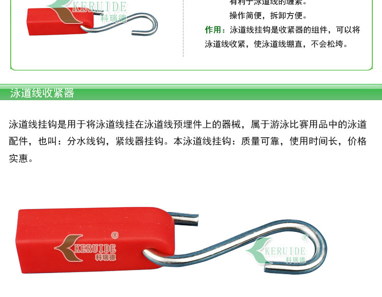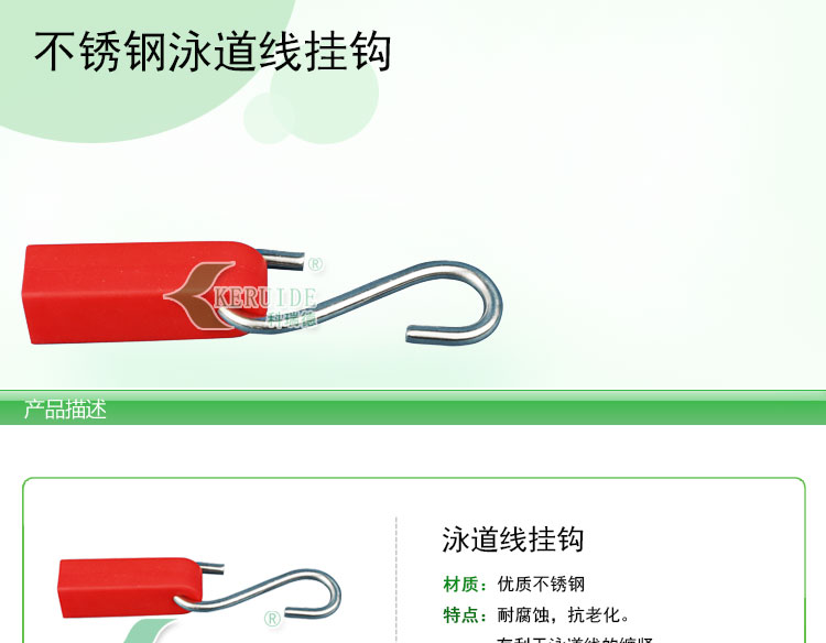 我公司銷售各種泳道線及其配件,泳道線掛鉤,泳道線收緊器,泳道線預埋件都是用304不銹鋼制成,質量可靠。整套購買劃算,歡迎新老客戶咨詢購買。咨詢客服了解 更多!!!