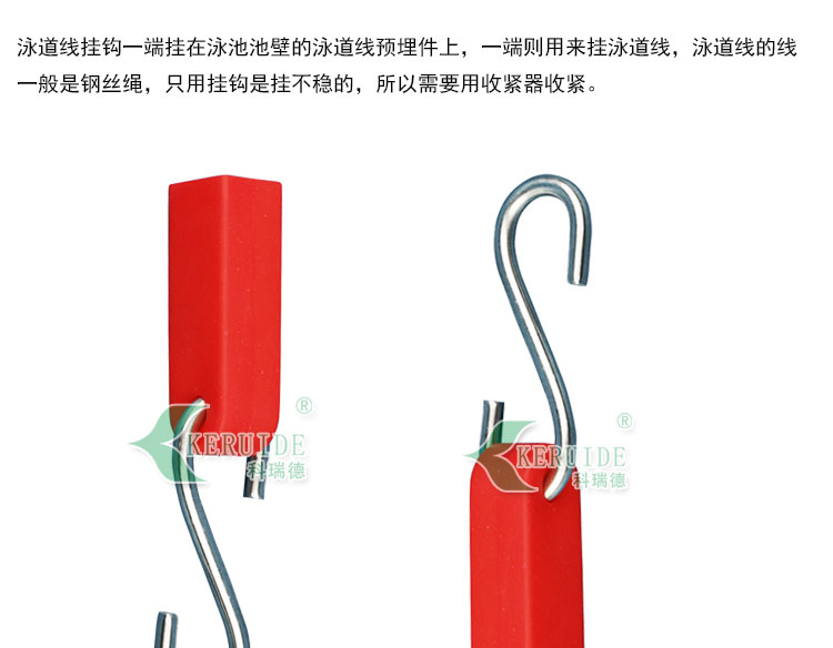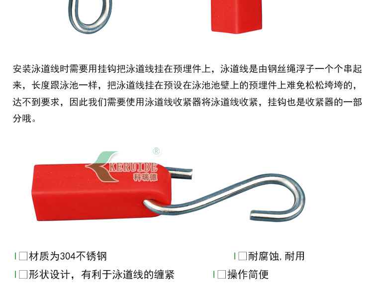 泳道線掛鉤是掛在泳道線預埋件上的器械,屬于游泳比賽用品中的泳道配件,也叫:分水線鉤,收緊器掛鉤。本泳道線掛鉤由304不銹鋼制成,質量可靠、價格實惠。泳道線掛鉤一端掛在泳池池壁的泳道線預埋件上,一端則用來掛泳道線,泳道線的線一般用鋼絲繩串成一條與泳池一樣的長度,然后再用收緊器收緊,掛鉤與收緊器連接。