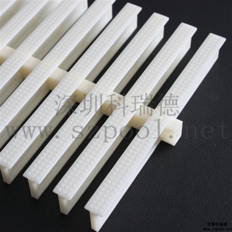 游泳池格柵又,名格柵,防滑渠面格柵或者是游泳池排水溝格柵。游泳池格柵是作為游泳池四周排水溝的塑料蓋板。本產品具有:防滑、耐腐蝕,抗老化等特性,組分容易,安裝簡單,它的梳形格柵接口不會堵塞,令清潔工作輕松方便,并可根據泳池的各種形狀隨意隨意拼接而無須裁剪。