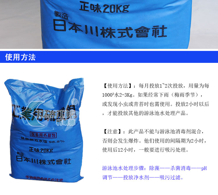 使用方法:每月投放1~2次投放硫酸銅除藻劑,用量為每10003水2~3Kg。如果經常下雨(梅雨季節),或發現小蟲或青苔時也需使用。投放硫酸銅滅藻劑2小時以后,才能投放其他的游泳池水處理藥劑。