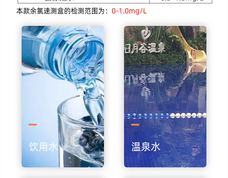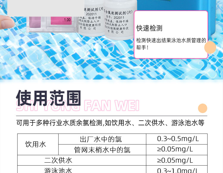 廣泛應用于各類游泳池水質檢測。DPD余氯快速測定盒已被各類游泳池,桑拿,溫泉等用于檢測水中余氯濃度使用。