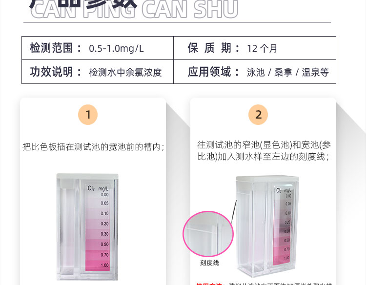 1,用比色皿在泳池水面下約20厘米處取水樣至刻度線;