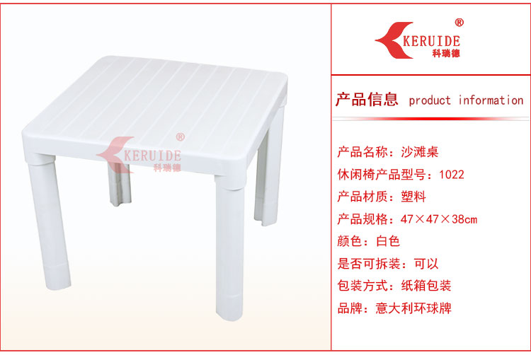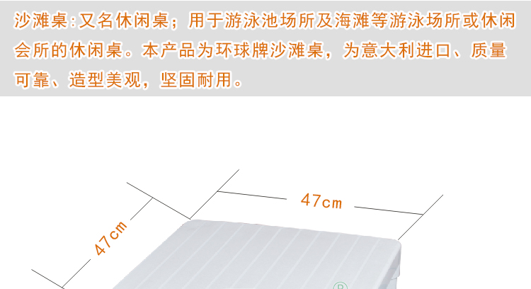 沙灘椅,又名塑料沙灘椅,休閑椅;用于游泳池場所及海灘等游泳場所或休閑會所的休閑桌椅,屬于休閑用品。本產(chǎn)品為環(huán)球牌沙灘椅,為意大利進(jìn)口。質(zhì)量可靠,耐老化,造型美觀,舒適耐用。