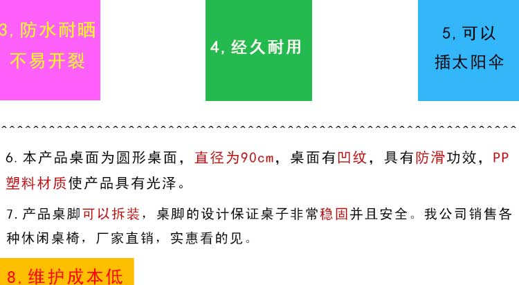 本產品為白色的戶外休閑桌椅,采用優質環保原料,產品結構堅固,抗日曬雨淋。桌子的面、腳是組裝而成,可拆卸,組裝簡單,清洗方便。
