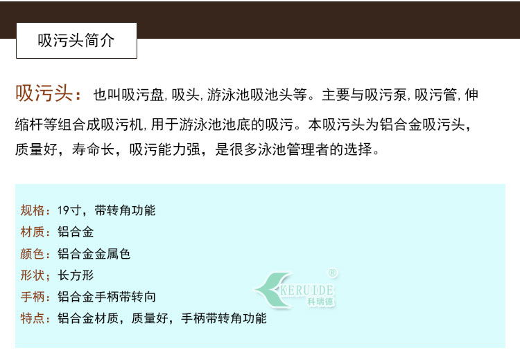 本吸污頭為19寸鋁合金吸污頭,鋁合金手柄,兩頭各6個(gè),轉(zhuǎn)動(dòng)方便靈活,可以清洗泳池池底。底部有刷毛,可以邊洗邊刷,而且鋁合金材質(zhì)厚重,不上浮,吸污干凈。