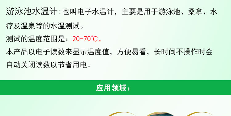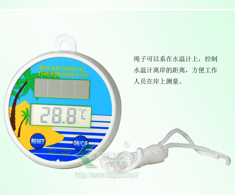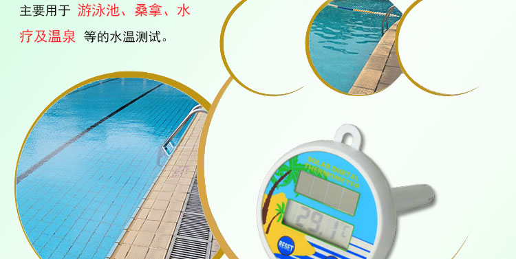 游泳池水溫計,也叫電子水溫計,是游泳池溫度計的一種。主要是用于檢測游泳池、桑拿、水療及溫泉等的水溫,檢測溫度范圍是:20-70℃。