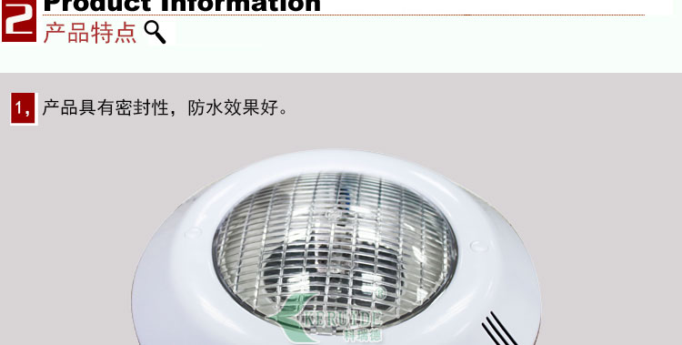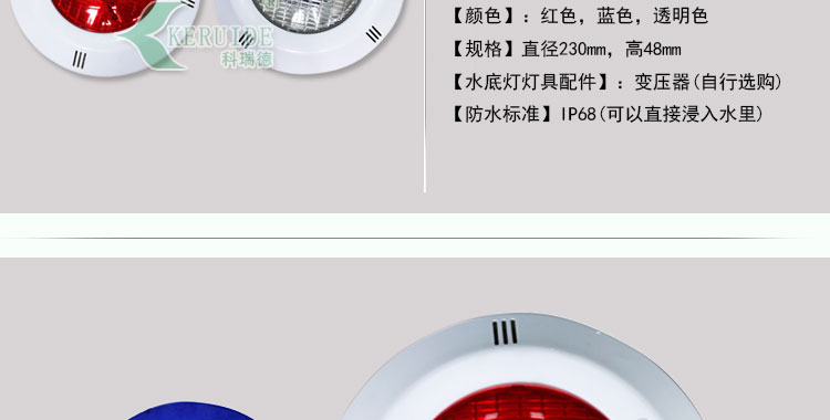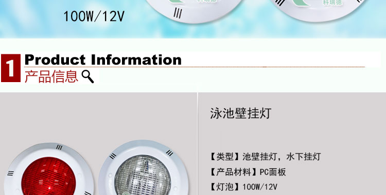 本產品特點:本產品具有效防水、采用安全電壓,性能穩(wěn)定可靠等優(yōu)點。防水性是購買泳池池壁掛燈首要考慮的因素,因為它可以避免漏電,是保證泳客安全的重要因素。本產品電壓為12V低電壓。購買產品的時候建議購買變壓器,本產品有紅色,藍色,無色等顏色可選,是裝飾泳池,景觀池等的理想產品。更多咨詢客服了解!