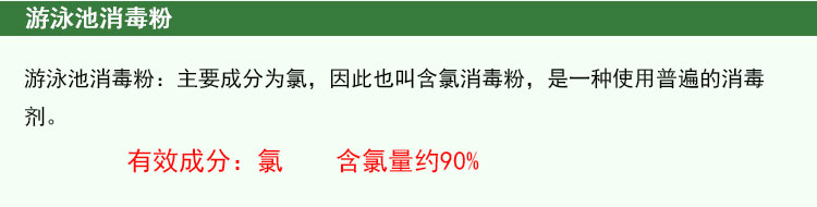 本游泳池消毒劑的主要成分為氯,且含有穩(wěn)定劑,在紫外線下較穩(wěn)定,相比其他游泳池消毒劑用量少,能節(jié)省成本,適合用于室外游泳池。