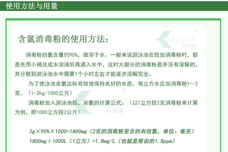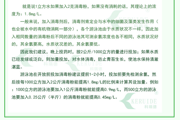 【用法用量】:用于游泳池水處理時(shí),投加量為1000立方水投放2公斤消毒粉,一般是先將含氯消毒粉用水桶裝水溶解后,再均勻?yàn)⑷胗斡境刂小S斡境赜究腿藬?shù)較多時(shí),收?qǐng)龊笠?000立方2-4公斤的藥量來(lái)投放,有效防止青苔生長(zhǎng),使池水保持清澈湛藍(lán)。