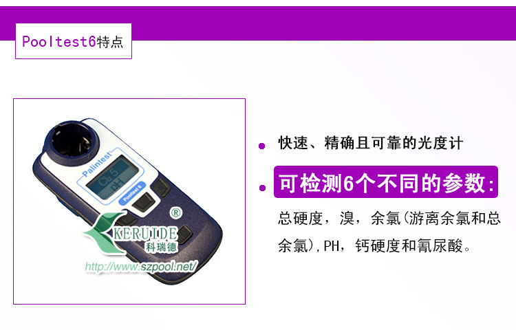 百靈達六參數水質檢測儀(Pooltest 6),也叫百靈達6參數水質檢測儀,直讀式光度計,可以檢測6個不同的參數,總堿度、溴、余氯(游離余氯和總余氯)、pH、鈣硬度和氰尿酸等,快速簡單、數據可靠,使用方便的特點,是游泳池水質維護的選擇。