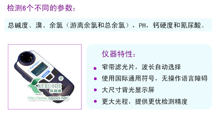 可檢測總硬度,溴,余氯(游離余氯和總余氯),PH,鈣硬度和氰尿酸;