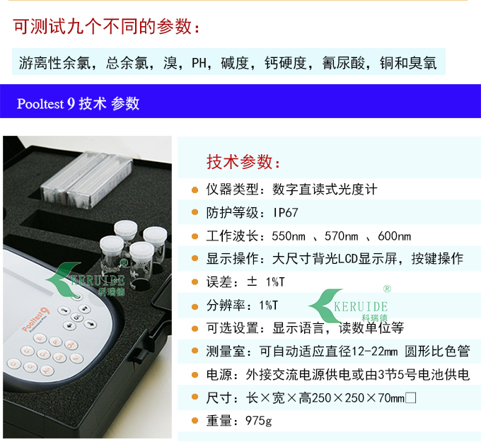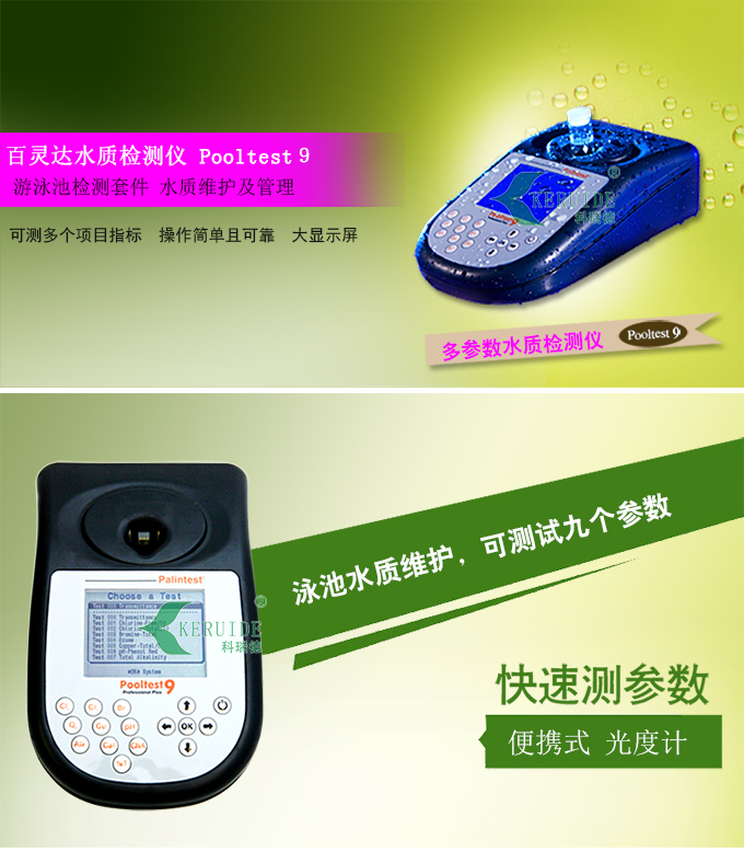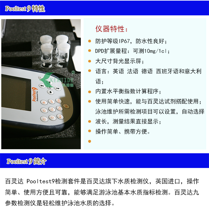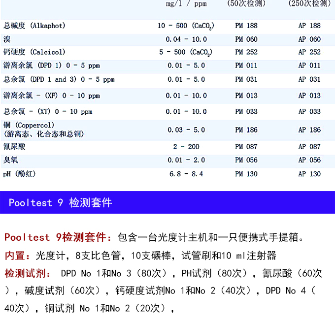 不過百靈達 Pooltest9主要用于泳池水質(zhì)維護,可測試九個參數(shù):游離氯,總余氯,溴,PH,堿度,鈣硬度,氰尿酸,銅和臭氧。