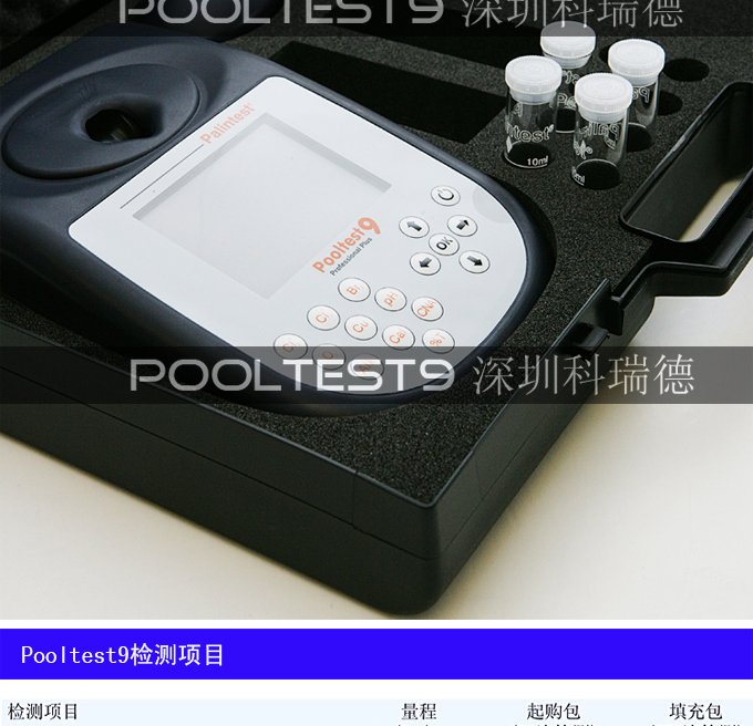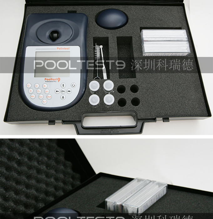 標準的Pooltest 9檢測套件包含一臺光度計主機和一只便攜式手提箱,