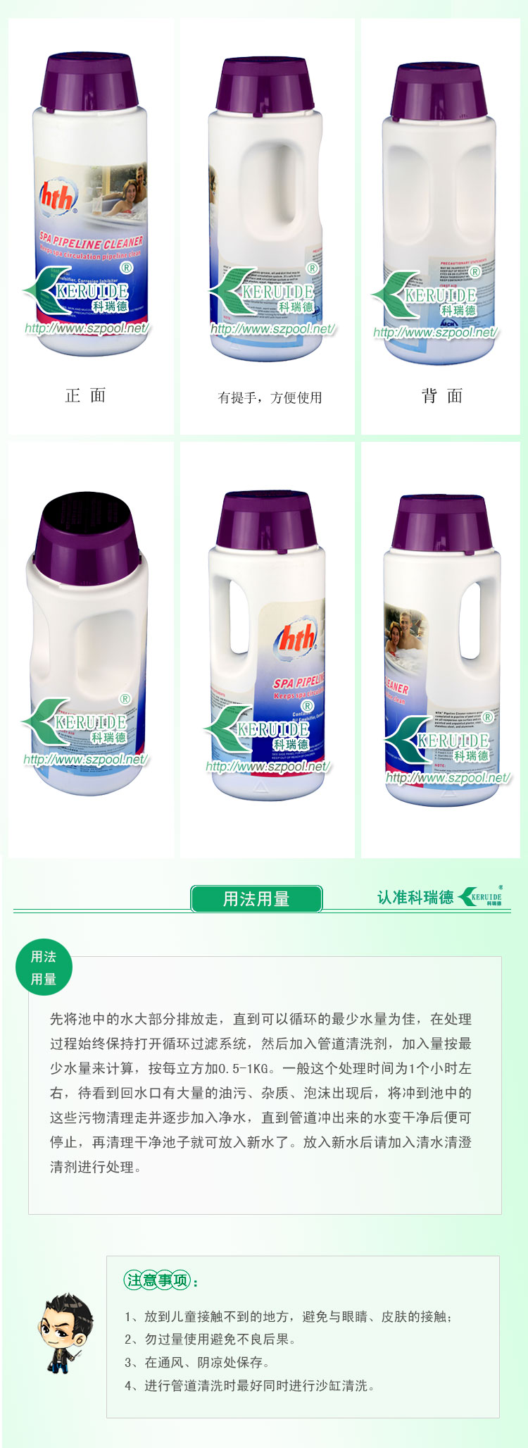 【功能】:管道清洗劑用于去除管道內(nèi)長期積存的油脂(來源于人體)、污物(來源于人體的代謝物)、浮銹等雜質(zhì); 輔助水質(zhì)凈化,增強(qiáng)其他HTH? 清水清SPA 水處理產(chǎn)品的功效; 預(yù)膜劑可以起到保護(hù)管道的作用; 輔助處理油脂形成的水線問題。