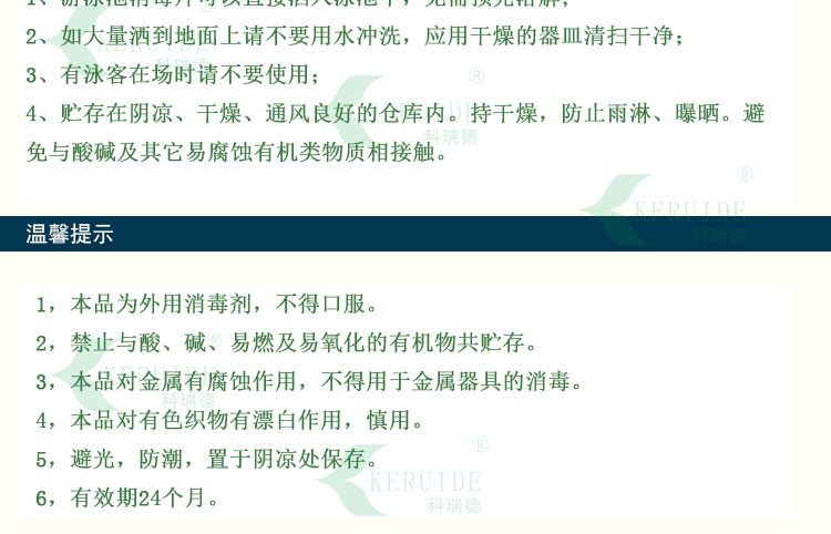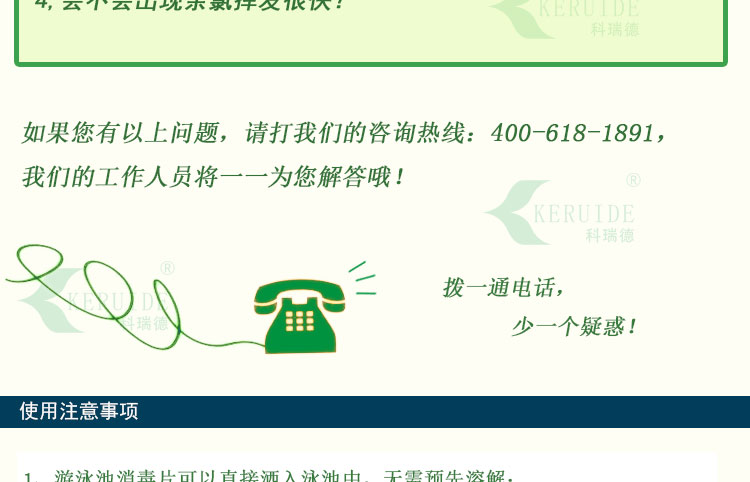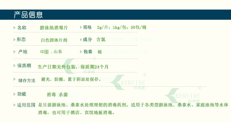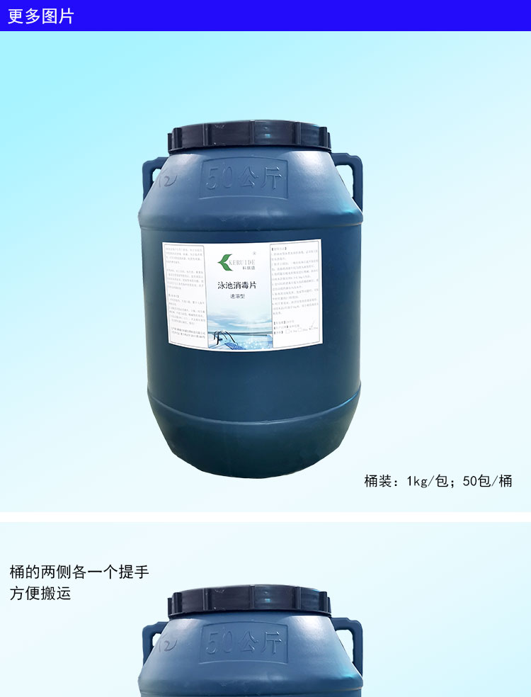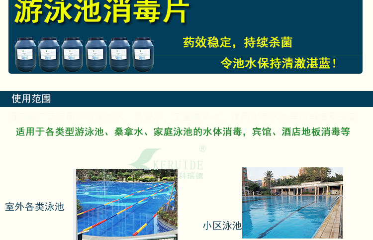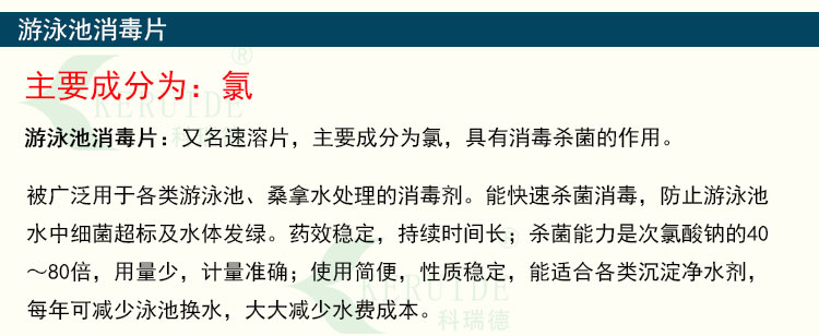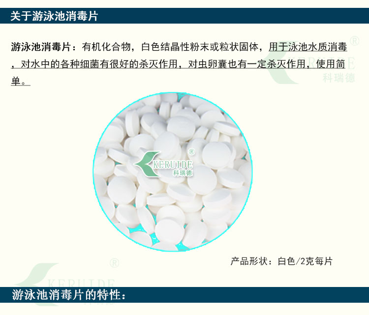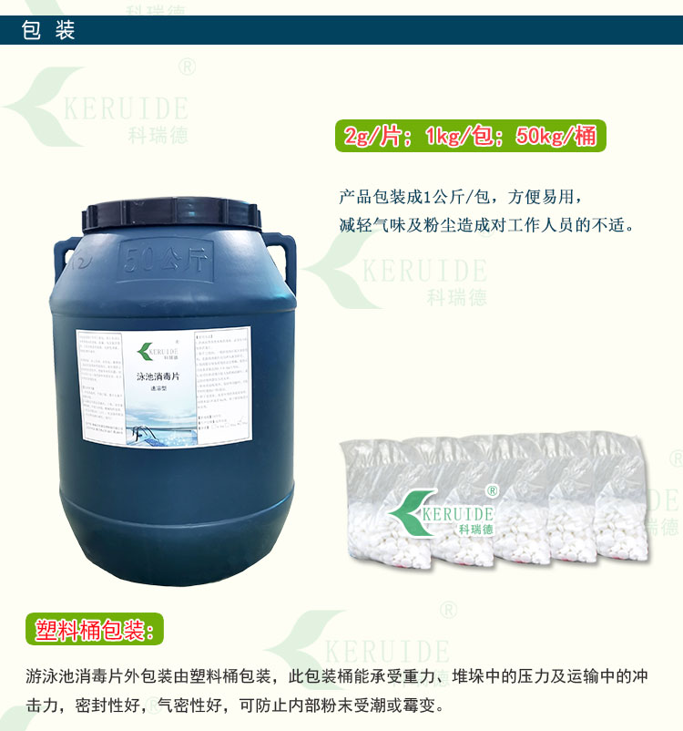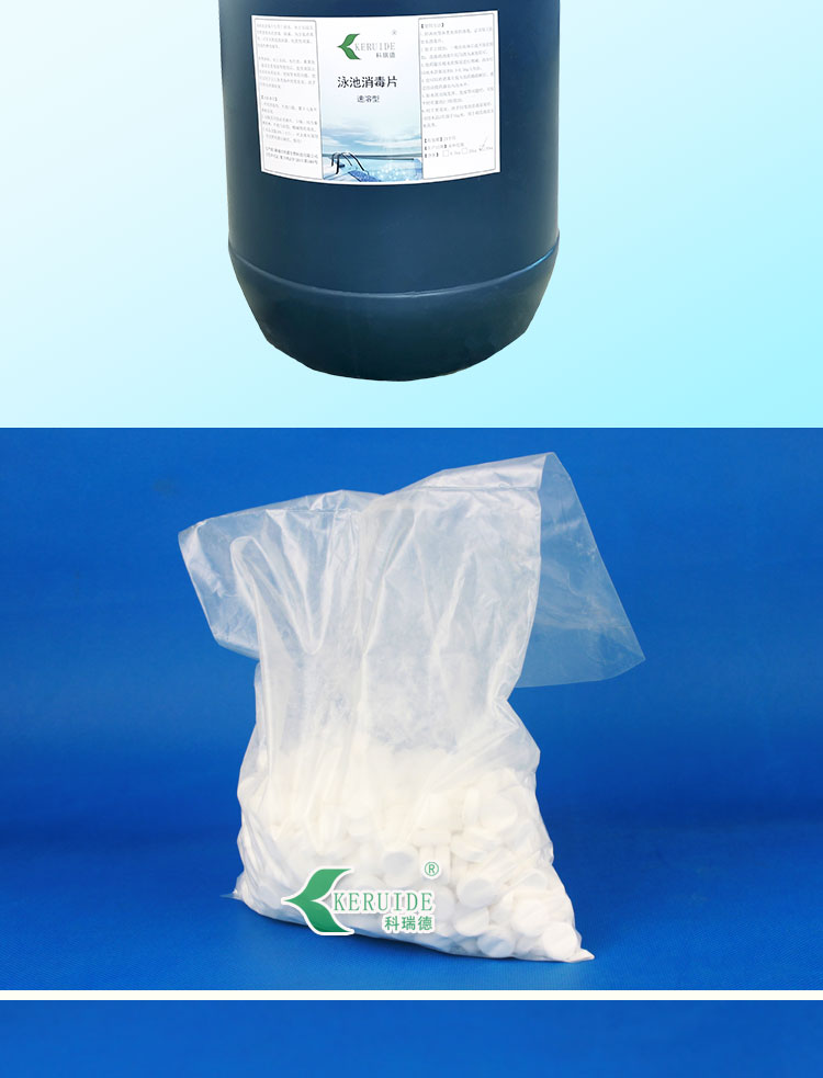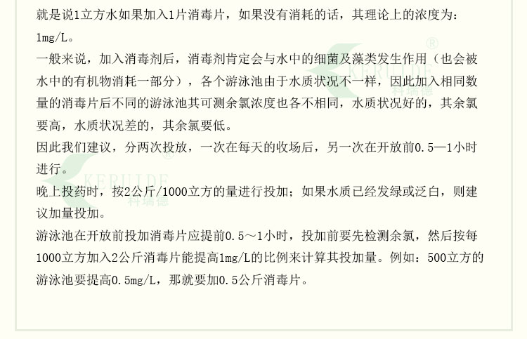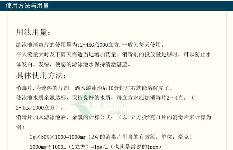 【用法用量】:用于游泳池水消毒時,每天用量約為每1000立方投放2-4公斤,泳客較多或下雨天氣時要適當地增加藥量。游泳池消毒片的投放量足夠時,可以防止水體發白、發綠,使你的游泳池水保持清澈湛藍。
