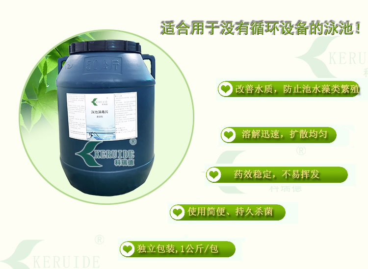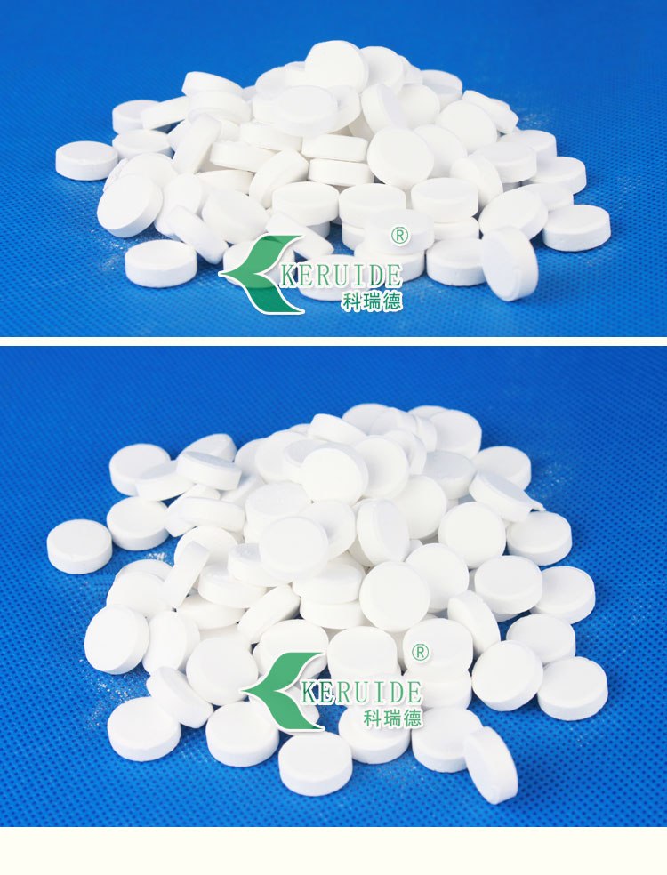 游泳池消毒片的溶解性比游泳池消毒粉好,可以直接灑入泳池中,消毒片在池底迅速溶解,均勻地擴散到整個泳池水中,能快速提高泳池水中的余氯,適合開場前補充余氯,并且特別適合沒有循環設備的泳池使用。游泳池消毒片的PH值接近中性,因此使用時對泳池水的PH值影響較小。