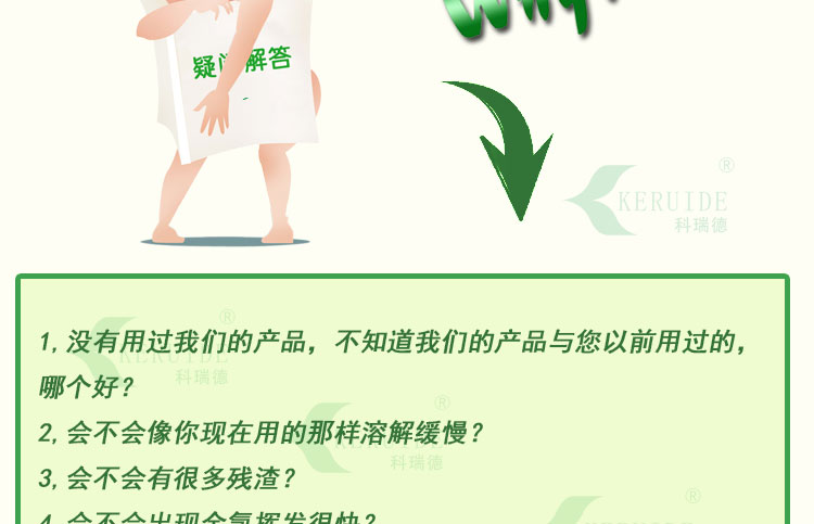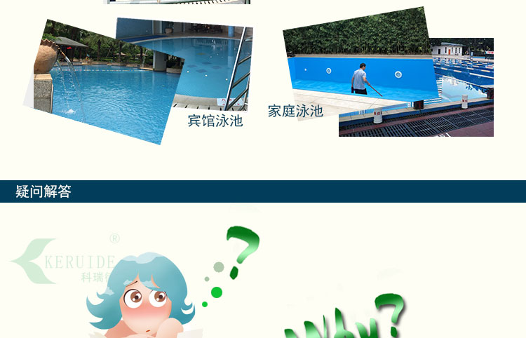 科瑞德速溶游泳池消毒片不僅可以用于日常泳池消毒維護,還可以用于快速補充余氯。一般泳池消毒是在晚上閉館后,以及早上開池前2小時進行消毒。夏季天氣熱,余氯揮發較快,而且夏季游泳的人特別多,對余氯的消耗也多,一般不到中午余氯就消耗完了。這時候就要進行余氯補充。由于夏季游泳的人多,有人在泳池中就不能投放消毒藥。因此很多泳池會在中午休息2小時,以便快速補充余氯。那么這時候就要選擇溶解快的消毒劑,此刻消毒片就是可以快速溶解的,10分鐘左右溶解完,而且可以直接投放進泳池中,使用方便。2小時后再開館,余氯達標,為泳客們營造了健康衛生的游泳環境。