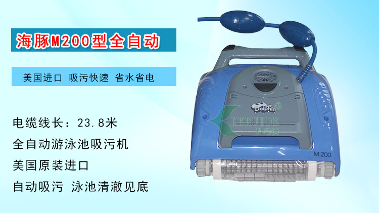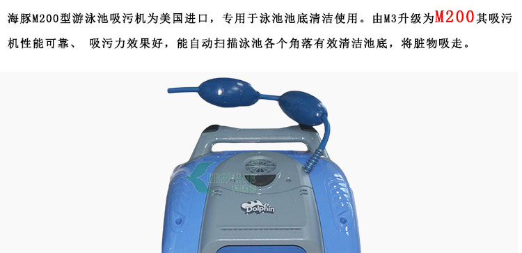 海豚吸污機M200型也叫游泳池全自動吸污機,時尚新穎、小巧便攜,是家庭、小型游泳池的選擇,主要用于私家泳池的池底吸污。