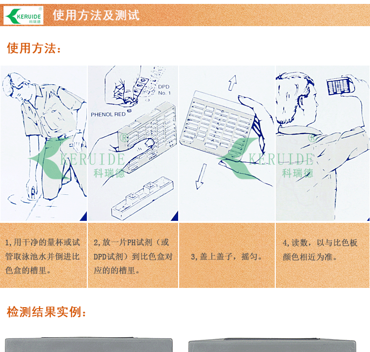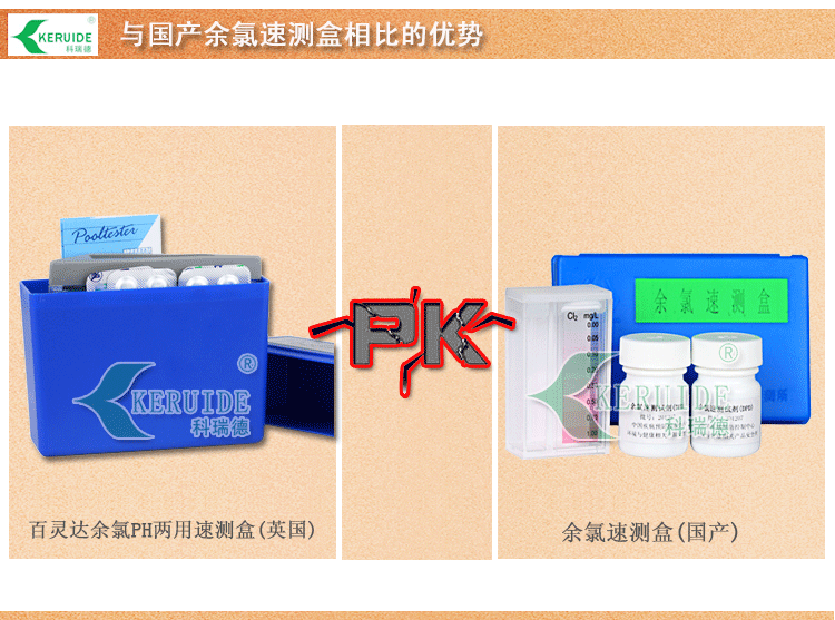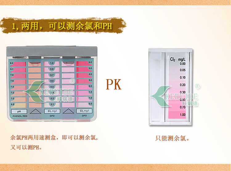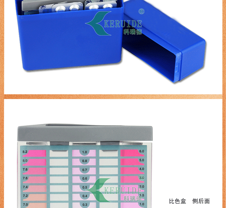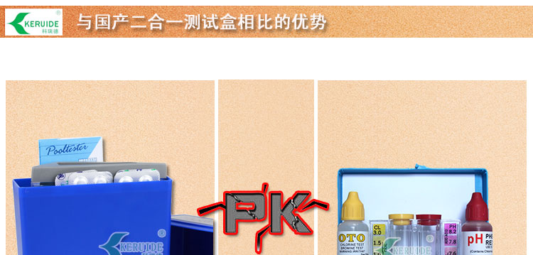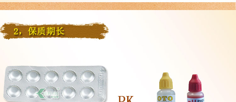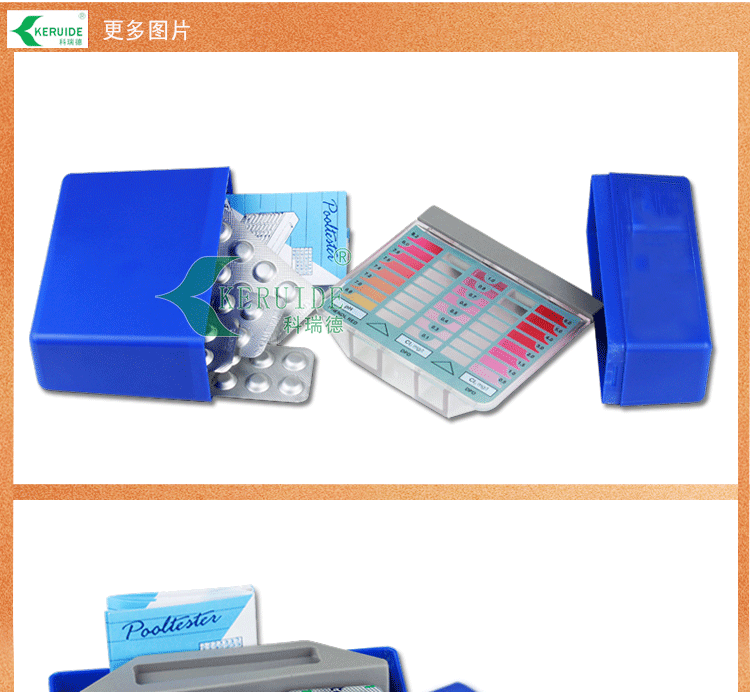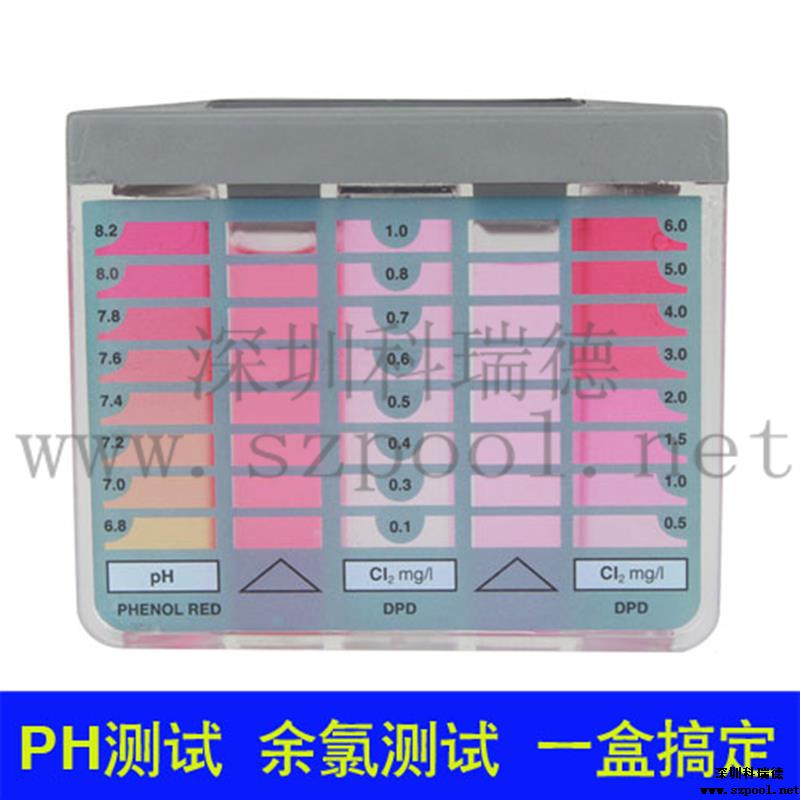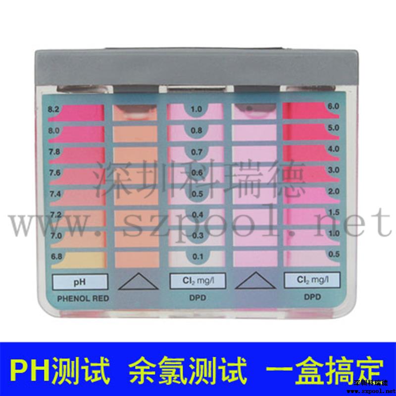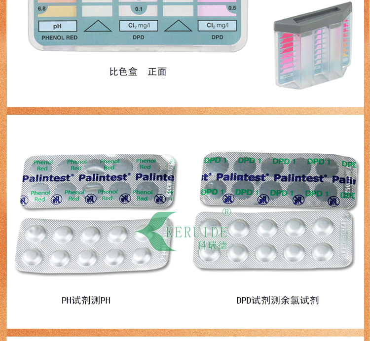 【配置】:主要包括包裝盒,比色盒,50片PH試劑,50片余氯試劑和說明書。(注:此配套試劑用于此測試盒檢測,不適用于光度計(jì)檢測)