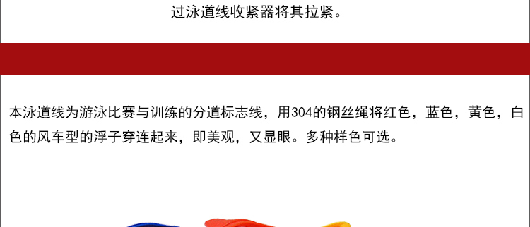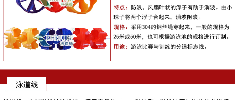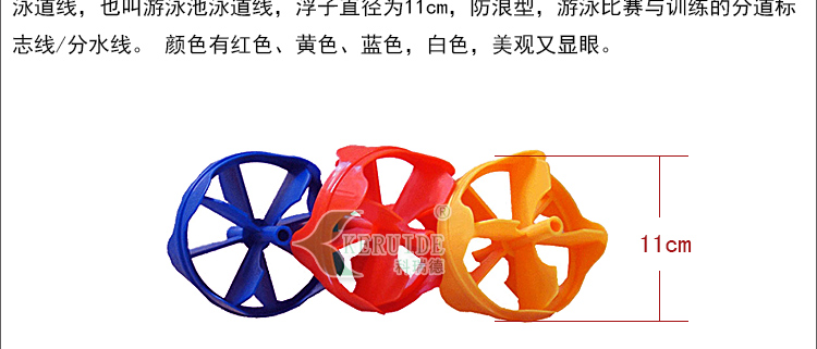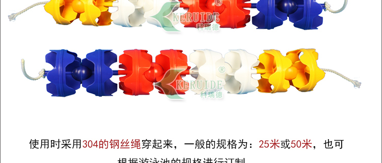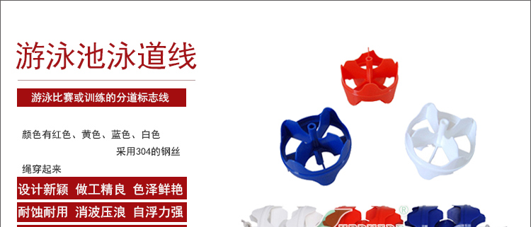 本款泳道線設計新穎:從產品圖片可以看出它是由小珠子將兩個浮子合起來,消波阻浪。做工精良:質量層層把關。色澤鮮艷:紅藍黃三種明亮的顏色,耐蝕耐用:抗老化,使用時間長。消波壓浪:自浮力強,易于安裝。