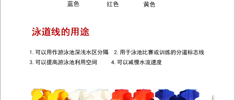 游泳池泳道線,也叫泳道線,直徑為11cm,防浪型,游泳比賽或訓練的分道標志線, 顏色分別有紅色、黃色、藍色、白色。