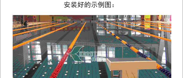 安裝:采用304的鋼絲繩穿起來,一般的規格為:25米或50米,也可根據游泳池的規格進行訂制。兩頭分別使用泳道線掛勾及泳道線收緊器,使其能掛在泳池上并通過泳道線收緊器將其拉緊。泳道線閑置時需要用泳線車收起來,我公司除提供各種各樣的泳道線外,還提供304不銹鋼泳線車,使用方便,便于搬運。