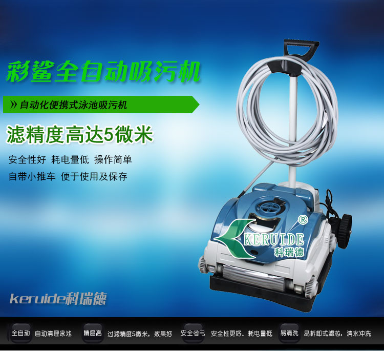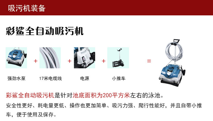 【適用范圍】彩鯊吸污機體積小,輕便,使用方便,適用于各類私家泳池、別墅泳池,小型泳池、桑拿會所泳池等。另外,彩鯊吸污機保修期為1年,客戶可放心購買和使用。