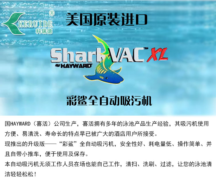 【品牌介紹】:彩鯊游泳池吸污機由美國HAYWARD亨沃(喜活)公司生產(chǎn),是皇后吸污機的升級版。喜活擁有多年的泳池產(chǎn)品生產(chǎn)經(jīng)驗,擁有先進的全自動吸污機技術(shù),使用方便、易清洗、壽命長。