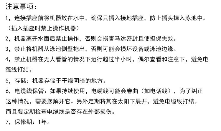 【使用方法】:取出彩鯊吸污機理順電纜線,慢慢平放到泳池中,插上電源,打上開關(guān),設(shè)定工作時間,它便會自己清理泳池,清理結(jié)束后,取出濾芯,用清水輕輕沖洗,晾干放回原位。首次使用時請按設(shè)定的最長時間讓其運行完一個完整的周期,讓其能記憶泳池的大小,在下次運行時路線更合理。
