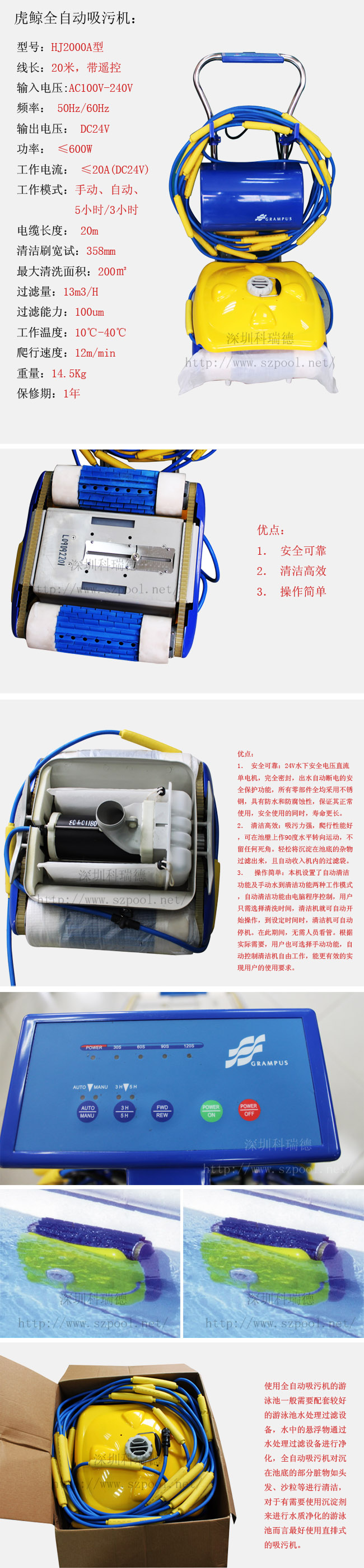 2. 清潔高效:吸污力強(qiáng),爬行性能好,可在池壁上作90度水平轉(zhuǎn)向運(yùn)動(dòng),不留任何死角。輕松將沉淀在池底的雜物過(guò)濾出來(lái),且自動(dòng)收入機(jī)內(nèi)的過(guò)濾袋。