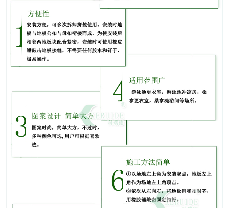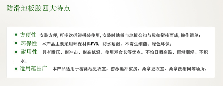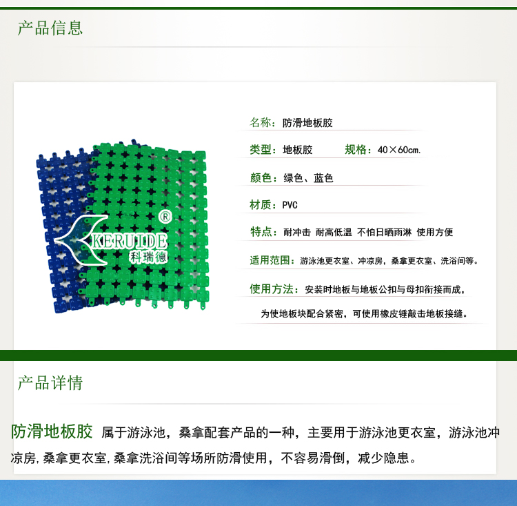 防滑地板膠屬于游泳池,桑拿配套產(chǎn)品的一種,主要用于游泳池更衣室,游泳池沖涼房,桑拿更衣室,桑拿洗浴間等場(chǎng)所的防滑,使人在這些場(chǎng)所不容易滑倒,保證安全.