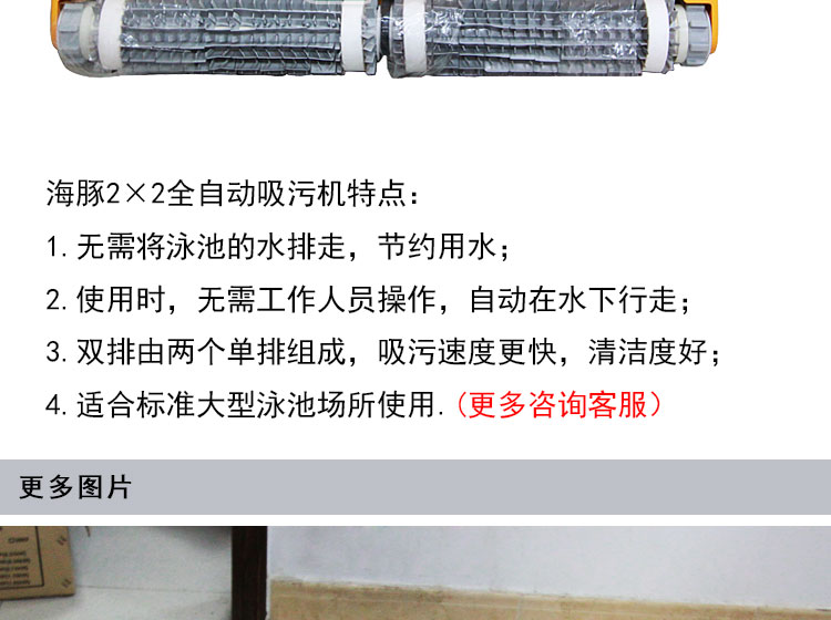 1,海豚2×2是由兩臺單體吸污機組合到一起,帶雙重刷子,雙高容量,雙層過濾,以及先進的陀螺儀,使它能全自動熟練地清潔整個泳池地板和墻壁。