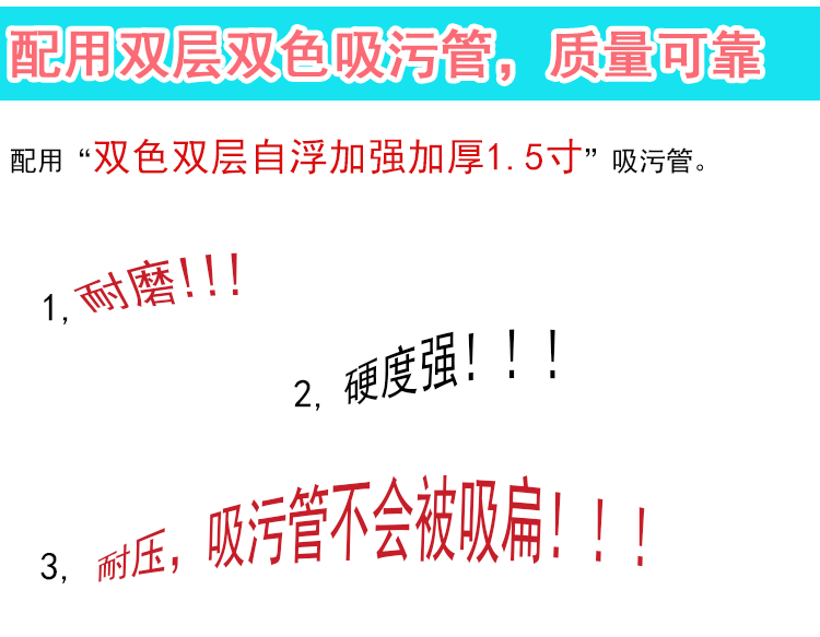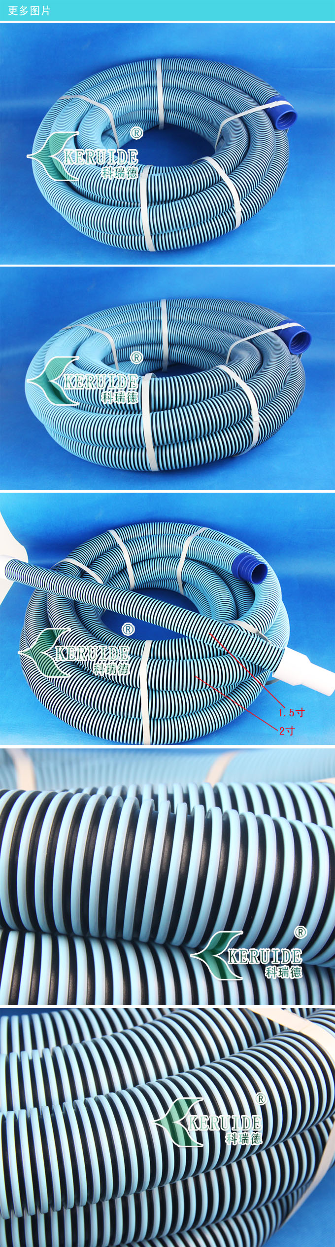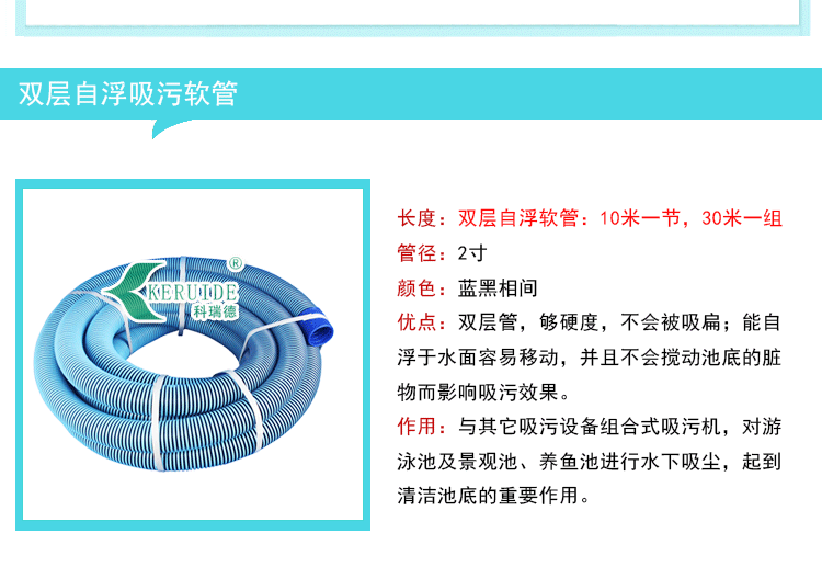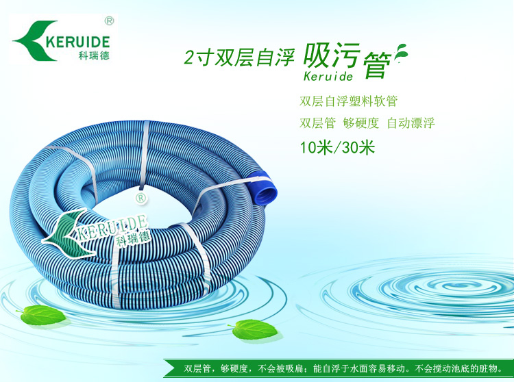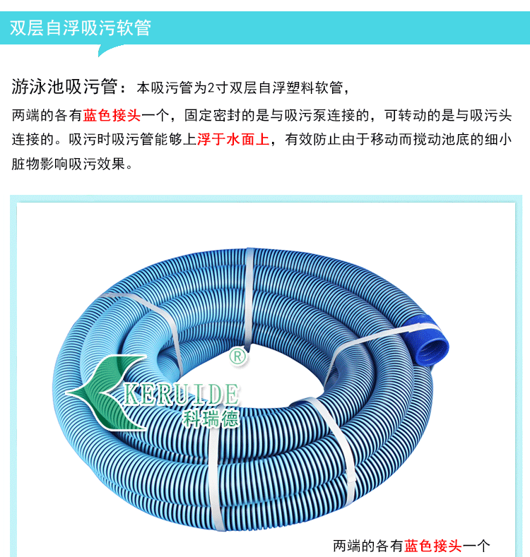 本吸污管為2寸雙層自浮塑料軟管,兩端的各有藍色接頭一個,固定密封的是與吸污泵連接的,可轉動的是與吸污頭連接的。吸污時吸污管能夠上浮于水面上,有效防止由于移動而攪動池底的細小臟物影響吸污效果。