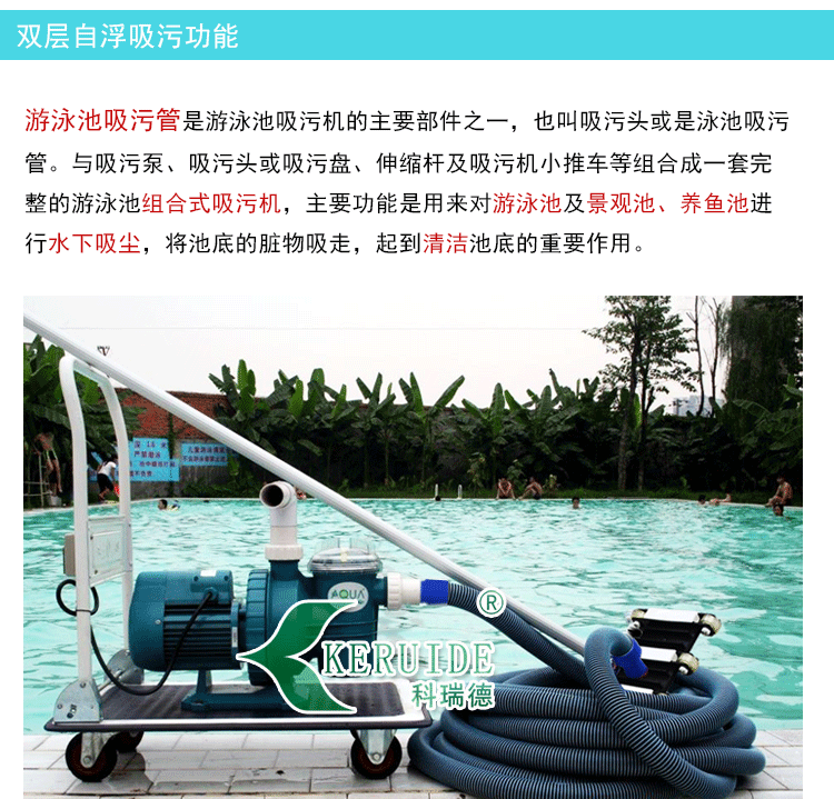 游泳池吸污管是手動吸污機的主要部件之一,也叫吸池喉。與吸污泵、吸污頭、伸縮桿及吸污機小推車等組合成一套完整的游泳池組合式吸污機,主要功能是用來對游泳池及景觀池、養(yǎng)魚池進行水下吸塵,將池底的臟物吸走,起到清潔池底的重要作用。