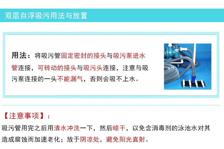 【注意事項】:吸污管用完之后最好用清水沖洗一下,然后瀝干,以免含消毒劑的泳池水對其造成腐蝕而加速老化;放于陰涼處,避免陽光直射。