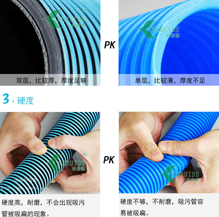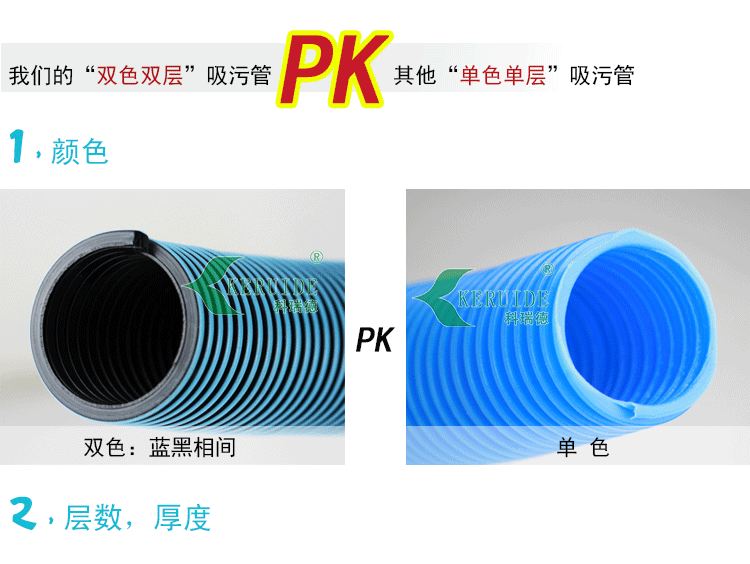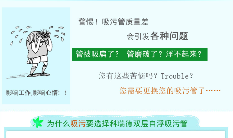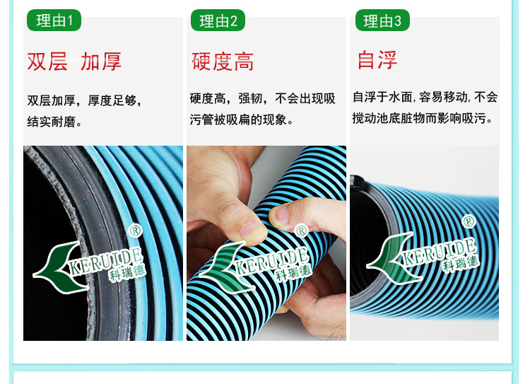【優(yōu)點】:雙層管,夠硬度,不會被吸扁;能自浮于水面容易移動,并且不會攪動池底的臟物而影響吸污效果。