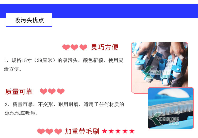【吸污頭】:本吸污頭為15英寸帶刷毛塑料吸污頭,加重加厚!配塑料手柄、底部帶毛刷,吸污時可以對池底進行刷洗,可以邊吸污邊刷洗池底,操作靈活、方便。